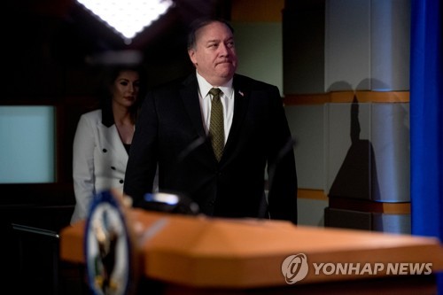 (워싱턴=연합뉴스) 백나리 특파원 = 마이크 폼페이오 미국 국무장관은 10일(현지시간) '2019 국제종교자유 보고서' 발간에 맞춘 브리핑에서 중국이 종교와의 전쟁을 계속하고 있다고 비난했다. 북한은 거론하지 않았다.