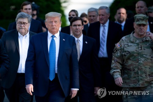 앞서 트럼프 대통령은 지난 1일 기자회견에서 '흑인 사망' 시위 사태 진압을 위한 군 동원 방침을 밝힌 직후 경찰이 백악관 인근 라파예트 공원에서 평화적으로 시위를 하던 사람들을 최루탄 등으로 강제 해산시키며 터준 길을 가로질러 세인트존스 교회를 방문, 성경을 들고 서 있는 이벤트를 연출한 것으로 엄청난 역풍에 직면했다.