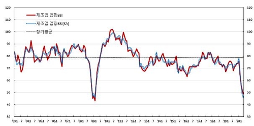 BSI란 기업가의 현재 경영상황에 대한 판단과 전망을 조사한 지표로, 부정적이라고 답한 곳이 긍정적이라고 본 업체보다 많으면 지수가 100을 밑돈다. 수치가 낮을수록 기업 체감경기가 나쁘다는 뜻이다.