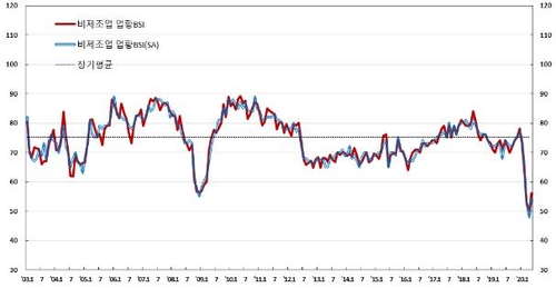 비제조업 업황 BSI는 유류비가 오른 영향으로 운수창고업(-8포인트) 등이 하락했으나 건설업(+11포인트), 도소매업(4포인트) 등을 중심으로 올랐다.