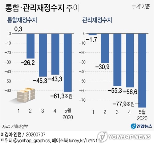 매월 누계 기준으로 통합재정수지 적자는 2월 26조2천억원, 3월 45조3천억원, 4월 43조3천억원에서 5월 60조원대로 껑충 뛰었다.