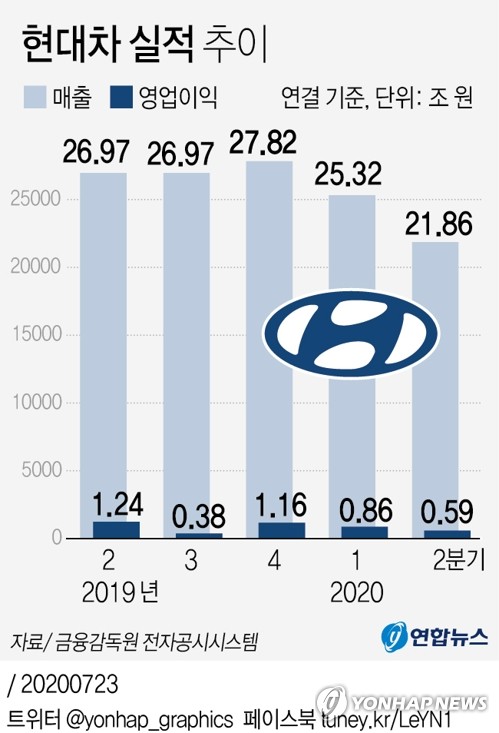 (서울=연합뉴스) 최윤정 기자 = 신종 코로나바이러스 감염증(코로나19) 여파로 현대차[005380] 영업이익이 절반으로 축소됐지만 예상보다는 양호한 수준이다.