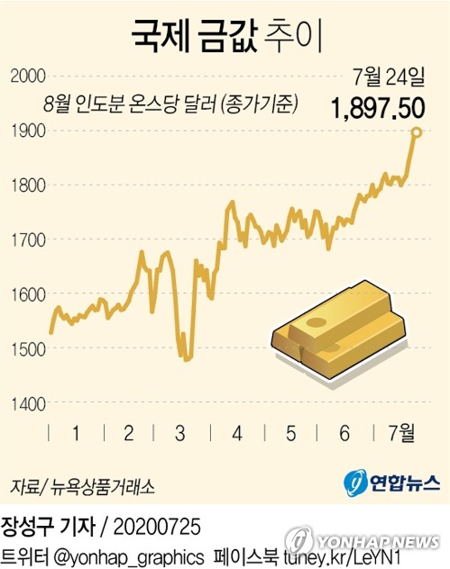 신종 코로나바이러스 감염증(코로나19) 여파에 따른 불투명한 경제 전망에 미국과 중국의 총영사관 폐쇄 공방으로 갈등이 고조된 것이 안전자산인 금 수요를 크게 끌어올린 것으로 분석된다.