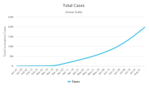 확진자 수가 2천만명을 넘은 것은 중국 우한의 정체불명 폐렴이 세계보건기구(WHO)에 보고된 작년 12월 31일 이후 7개월여 만이다.