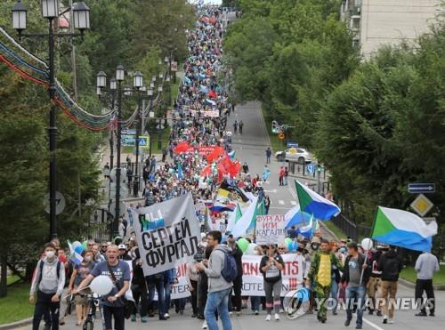 (블라디보스토크=연합뉴스) 김형우 특파원 = 러시아 극동 도시 하바롭스크에서 29일(현지시간) 전 주지사인 세르게이 푸르갈의 구속에 항의하는 집회가 8주째 이어졌다.