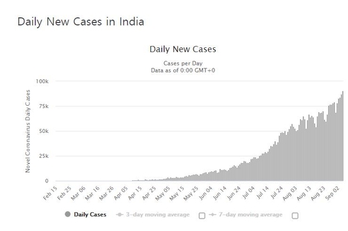 인도는 이미 지난달 30일 신규 확진자가 7만8천761명 발생하면서 미국이 갖고 있던 일일 세계 최다 기록을 뛰어넘은 바 있다.