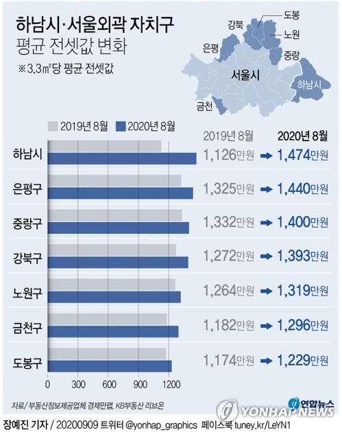 하남시는 지난해 8월만 하더라도 3.3㎡당 아파트 평균 전셋값이 1천126만원으로 서울 외곽인 노원구(1천264만원), 도봉구(1천174만원), 강북구(1천272만원), 중랑구(1천272만원), 은평구(1천325만원), 금천구(1천182만원)보다 낮았다.
