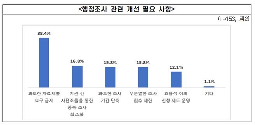정부가 행정조사와 관련해 개선해야 할 점을 묻는 말에는 '과도한 자료 제출 요구 금지'(38.4%), '기관 간 사전조율을 통한 중복조사 최소화'(16.8%), '조사 기간 단축 및 횟수 제한'(15.8%), '효율적 이의신청 제도 운용'(12.1%) 순으로 답이 나왔다.