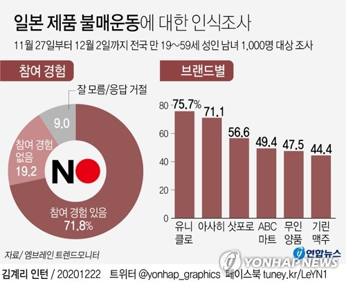 22일 시장조사전문업체 엠브레인 트렌드모니터에 따르면 지난달 27일부터 이달 2일까지 전국 만 19~59세 성인 남녀 1천 명을 대상으로 일본 제품 불매운동에 대한 인식조사를 한 결과 71.8%가 참여 경험이 있다고 답했다.