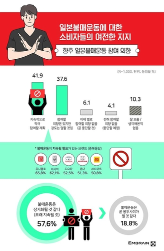 향후 일본 제품 불매운동 참여 계획을 묻는 말에는 41.9%가 '지속적으로 적극 참여하겠다'고 답했다. '참여할 의향은 있으나 강도는 덜할 것'이라는 답은 37.6%였다.