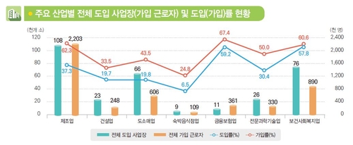 산업별 도입률은 금융보험업이 59.2%로 가장 높다. 보건사회복지업이 57.8%, 제조업 37.3%, 도소매업 19.8%, 건설업 19.7%, 숙박음식업이 6.5%로 뒤를 따른다.