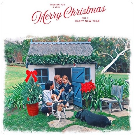 카드 속 사진에선 해리 왕자, 부인 메건 마클 왕자비, 한 살 아들 아치가 개 두 마리와 함께 야외 장난감 집에 앉아있다.