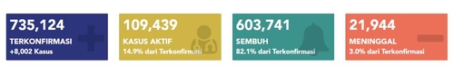 인도네시아의 코로나19 확진자는 전날 8천2명이 추가돼 누적 73만5천124명이고, 사망자는 누적 2만1천944명이다.