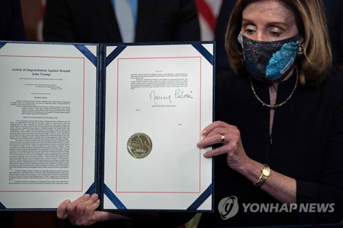 펠로시 의장이 서명한 탄핵소추안은 상원에 송부된다. 하원이 트럼프 대통령에 대한 탄핵소추안을 통과시킨 건 이번이 두번째로, 트럼프 대통령에겐 내란 선동 혐의가 적용됐다.