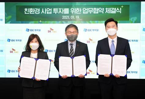 (서울=연합뉴스) 홍국기 기자 = SK건설은 서울 종로구 수송동 지플랜트(G.plant) 사옥에서 IBK캐피탈, LX인베스트먼트와 친환경 사업투자를 위한 전략적 업무협약(MOU)을 체결했다고 20일 밝혔다.