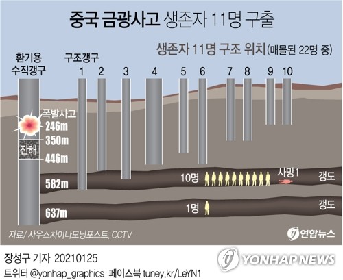 (선양=연합뉴스) 차병섭 특파원 = 중국 금광 폭발사고 현장에서 생존자 11명을 극적으로 구조한 현지 당국이 사고 발생 16일째인 25일 실종상태인 10명을 찾는 수색작업에 박차를 가하고 있다.
