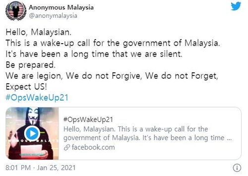 당시 어나니머스는 트위터, 페이스북 계정에 "말레이시아 정부에 보내는 모닝콜이다. 우리는 오랫동안 침묵했다. 이제 눈을 뜰 때다. 준비하라"고 경고하며 해시태그(#OpsWakeUp21)를 사용했다.