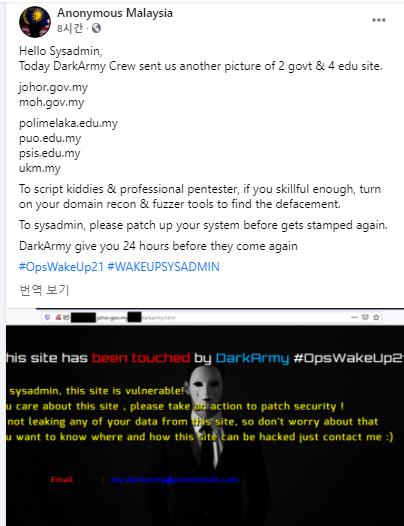 하지만, 같은 날 밤 어나니머스는 조호르주와 보건부 사이트, 4개 교육기관 사이트 등 6개 사이트를 공격했다며 스크린 캡처와 함께 또 글을 올렸다.