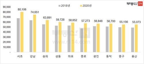 강남구는 평균 전셋값이 2018년 6억3천448만원에서 지난해 7억4천651만원으로 1억1천203만원 상승했다.