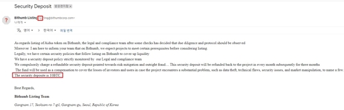이들이 쓴 이메일 주소를 자세히 보면 실제 빗썸의 이메일 주소(listing@bithumbcorp.com)와는 달리 리스팅(listing)의 첫 글자가 대문자 '엘(L)'로 돼있다.
