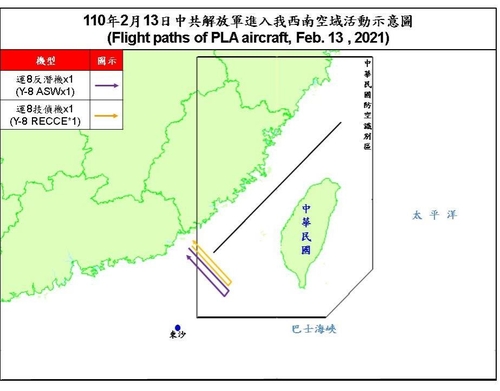 (홍콩=연합뉴스) 윤고은 특파원 = 조 바이든 미국 대통령과 시진핑(習近平) 중국 국가주석이 춘제(春節·중국의 설)를 하루 앞둔 11일 첫 전화통화에서 대만 문제를 놓고 부딪힌 가운데, 중국 군용기가 13일에도 대만 방공식별구역(ADIZ)에 진입했다.