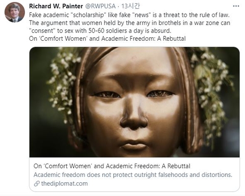 페인터 교수는 램지어 교수의 이번 논문을 싣기로 한 국제 학술 저널 국제법경제리뷰(IRLE)를 비판하는 트윗도 앞서 올렸다.