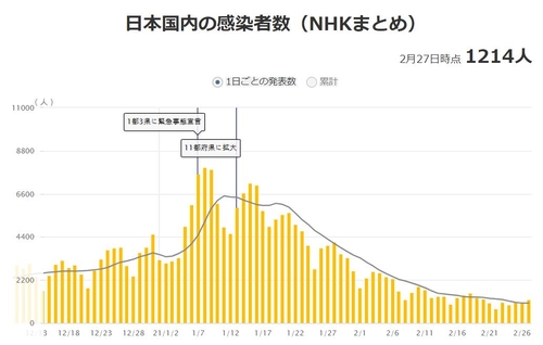 28일 현지 공영방송 NHK 집계에 따르면 전날 일본 전역에서 새로 확인된 코로나19 확진자는 1천214명이다.