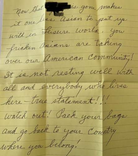 (서울=연합뉴스) 김유아 기자 = 미국에서 아시아인에 대한 증오범죄 우려가 높아진 가운데 이번에는 캘리포니아주의 한 한국계 미국인에게 증오 섞인 내용의 협박 편지가 배달돼 경찰이 수사에 나섰다.