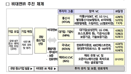 벤처·스타트업은 이동통신3사, 대기업, 국내 벤처 투자사, 해외 벤처 투자사 등 4개 그룹으로 진행되는 비대면 IR에 참여할 수 있다.