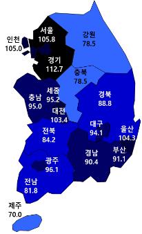 경기 뿐만 아니라 서울(105.8)과 인천(105.0)도 기준선을 웃돌았다.