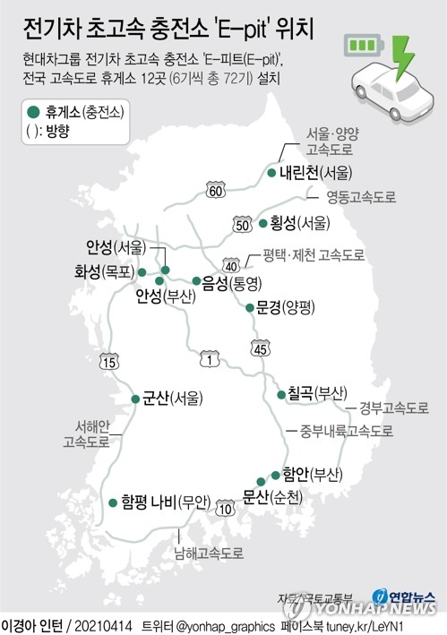 (서울=연합뉴스) 장하나 윤보람 김기훈 기자 = 현대자동차그룹이 15일부터 전국 고속도로 휴게소 12곳에서 전기차 초고속 충전소를 운영하는 등 국내 전기차 생태계 구축을 위해 초고속 충전 인프라 확대에 본격적으로 나섰다.