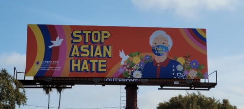 옥외 광고판은 최근 증오범죄 가해자의 표적이 되곤 했던 백발의 아시아계 할머니가 '증오는 바이러스'라는 마스크를 쓰고 있는 그림을 담았다.