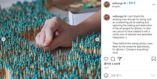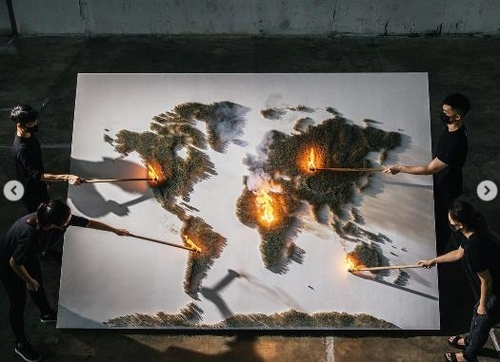 (자카르타=연합뉴스) 성혜미 특파원 = 말레이시아의 예술가가 성냥개비 5만개로 세계 지도를 만든 뒤 불을 붙여 미국 시사주간지 '타임'의 표지를 장식했다.