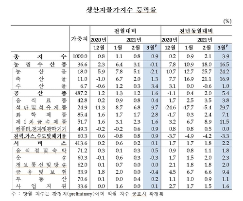 21일 한국은행에 따르면 3월 생산자물가지수는 2월(105.91)보다 0.9% 높은 106.85(2015년 수준 100)로 집계됐다.