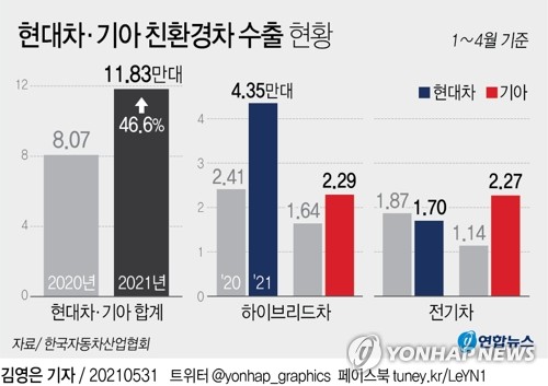 업계 관계자는 "지난해 추가된 하이브리드와 플러그인하이브리드 모델의 해외 판매가 올해부터 본격화되고, 작년 수출이 코로나19로 감소한 탓에 기저효과가 작용하면서 전체 친환경차 판매가 늘었다"며 "해외 시장에서 아이오닉 5에 대한 기대감도 높아지고 있다"고 말했다.