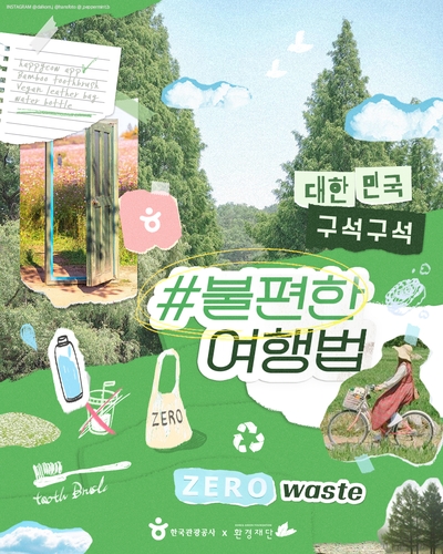 [게시판] 관광공사, 친환경 '불편한 여행' 캠페인▲ 한국관광공사는 오는 10월까지 여행지에서 일회용품 줄이기, 여행 기념품 포장 줄이기, 친환경 제품 이용하기 등의 작은 실천을 통해 지역 관광자원을 보호하고 지속 가능한 관광을 실천하는 '불편한 여행' 캠페인을 벌인다고 2일 밝혔다. (서울=연합뉴스)(끝)<저작권자(c) 연합뉴스, 무단 전재-재배포 금지>