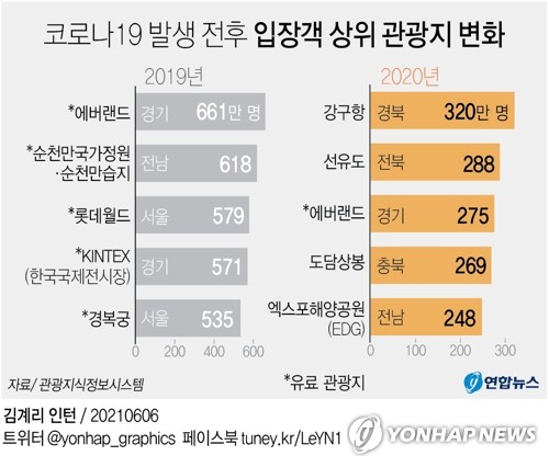 (서울=연합뉴스) 이태수 기자 = 지난해 신종 코로나바이러스 감염증(코로나19)의 영향으로 놀이공원 등 수도권 대형 밀집 시설의 인기가 떨어지고 지방 자연 명소를 찾는 발길이 늘어난 것으로 나타났다.