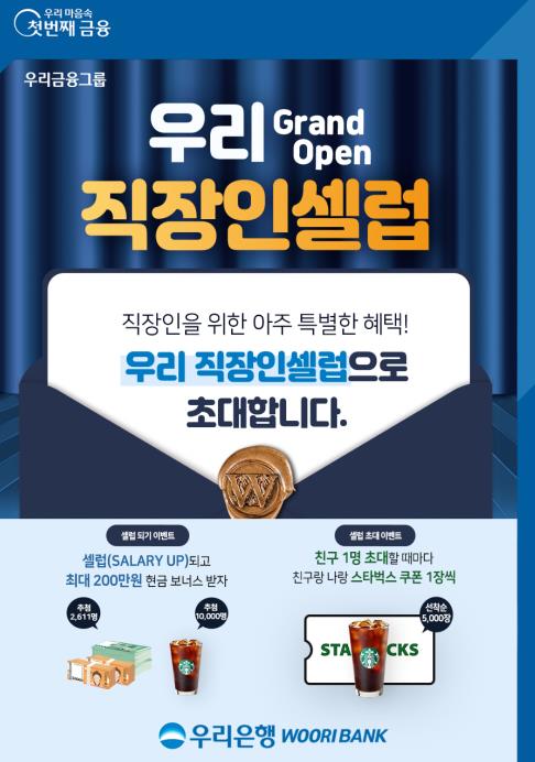 우리은행 급여이체 고객에게 '위비꿀머니' 최대 200만 포인트와 스타벅스 모바일 쿠폰, GS25와 배달의 민족 모바일 상품권 등 경품을 매달 추첨을 통해 지급한다. (서울=연합뉴스)