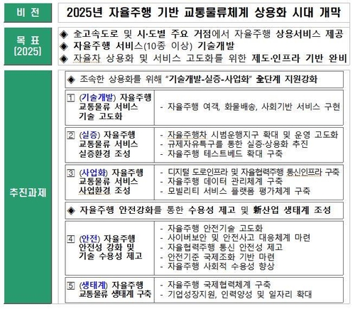 (서울=연합뉴스) 김기훈 기자 = 2025년 전국 고속도로와 시·도별 주요 거점에서 자율주행 서비스가 상용화되고, 자율차 서비스 고도화를 위한 제도·인프라 기반을 갖추게 된다.