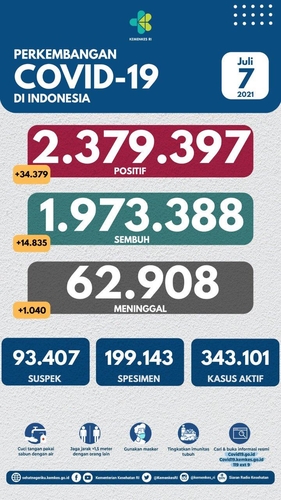 인도네시아 보건부는 이날 확진자 수가 3만4천379명 추가돼 누적 237만9천여명, 사망자가 무려 1천40명 늘어나 누적 6만2천908명이라고 발표했다.