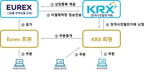 기존 유렉스 연계 코스피200선물, 코스피200옵션, 미니코스피200선물 야간거래와 같은 방식이다.