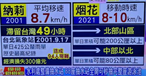 게다가 전날 저녁까지 이번 태풍의 속도가 시속 8~10km인 것으로 알려짐에 따라 태풍의 속도가 시속 8.7km로 지난 2001년 대만에 큰 인명 피해를 안긴 태풍 '나리'의 악몽을 떠올린다고 EBC 방송이 전했다.