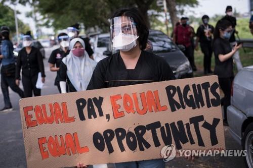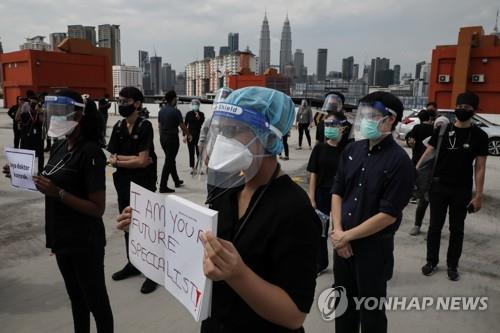 (자카르타=연합뉴스) 성혜미 특파원 = 코로나 폭증 사태를 겪는 말레이시아의 국공립병원 계약직 의사들이 정규직 채용을 요구하며 검은 옷을 입고 집단 시위를 벌였다.