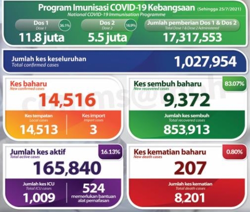 말레이시아의 확진자는 전날 1만4천516명 추가돼 누적 102만7천954명, 사망자는 207명이 추가돼 누적 8천201명이다.