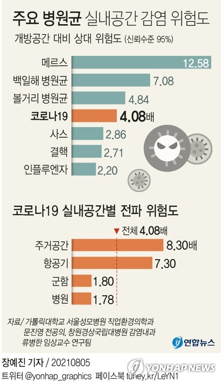 병원균별 감염 상대 위험도는 2015년 유행했던 메르스가 12.58배로 실내 공간에서 가장 전파 위험이 높았다. 이어 백일해를 일으키는 병원균이 7.08배였고, 볼거리 병원균 4.84배, 코로나19 4.08배, 사스 2.86배, 결핵 2.71배, 인플루엔자 2.20배 순이었다.