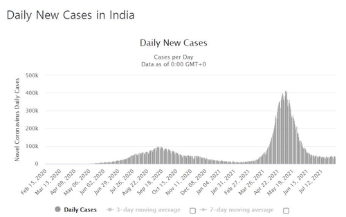 한편, 지난 5월 초 41만명을 넘었던 인도의 코로나19 신규 확진자 수는 꾸준히 줄어들어 최근 4만명 안팎을 기록 중이다.