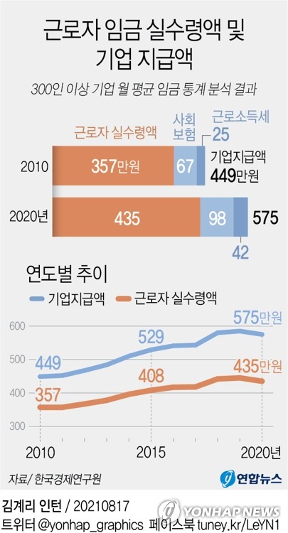 (서울=연합뉴스) 김보경 기자 = 최근 10년간 근로소득세와 사회보험료가 임금보다 빠르게 증가해 기업이 지급하는 액수와 근로자가 실제로 받는 금액의 차이가 벌어졌다는 분석이 나왔다.