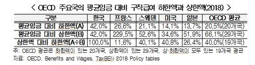 구직급여 상·하한액이 모두 있는 OECD 19개국 중 상한액 대비 하한액 비율도 한국이 가장 높았다.