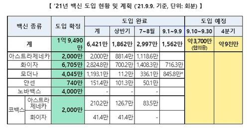 정부가 개별 제약사 및 국제기구와 계약하거나 국제협력을 통해 확보한 백신은 모더나, 화이자, 아스트라제네카, 얀센, 노바백스 5종 총 1억9천490만회분이고 이날까지 총 6천421만회분이 도입됐다.