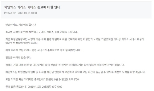 체인엑스는 원화와 코인 출금 마감일을 다음 달 29일로 정했다. 그러면서 "소수의 회원이 출금하지 않았다. 아직 원화 출금을 하지 않은 회원은 기한 안에 반드시 출금해야 한다"고 공지했다.